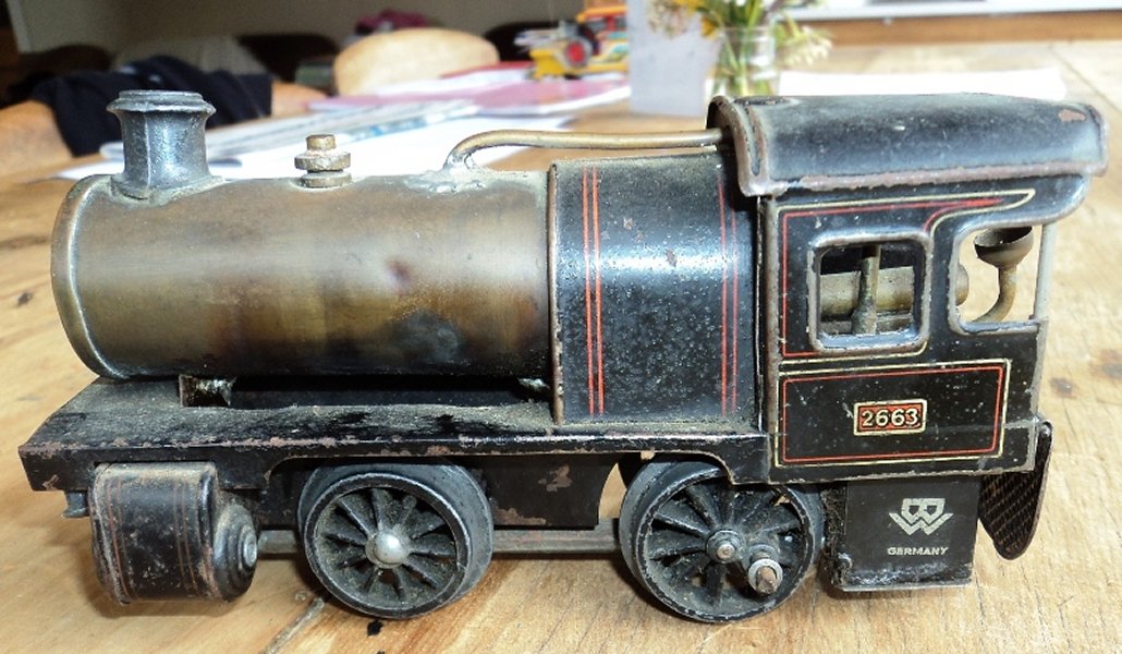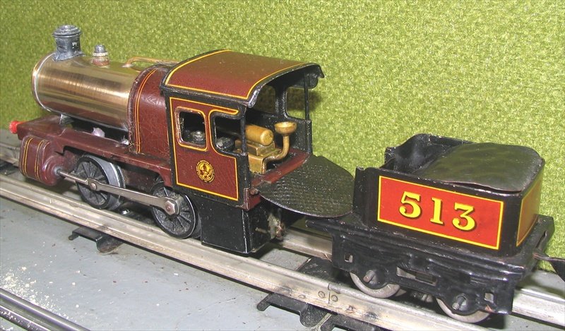 | Notes: | Small Bing `superforce` locomotive made about 1926. The single cylinder and flywheel can be seen in the cab. A smooth and steady runner. A quaint thing is that one side of the cab is letterred `London Midland Scottish` but the other side has `London Midland Schottish`. The Germans made a minor error! |