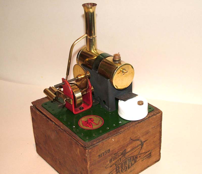 The Bowman M158 dates from mid 1920s to early 1930s. This engine has the optional chimney which was available for this engine. Basically a single cylinder M140, the M158 is a compact powerful engine unit. This engine comes complete with its box, burner, filler funnel and very rare Bowman Tags.