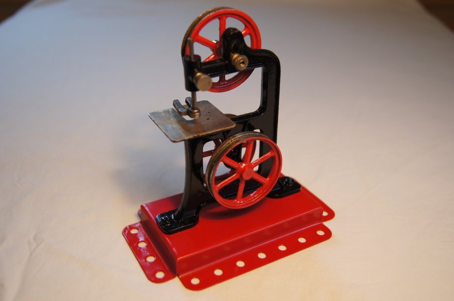 This band saw has a solid metal base, and cast iron body. The wheels are also cast with a none slip inner edge. The lower left hand wheel being driven by the engine transfer dirve band and this in turn drives the lower right hand wheel. That wheel would be connected to the upper drive wheel by a fleixable saw blade currently demonstrated with a rubber band as a blade. The blade passes through a movable guide foot. The upper wheel is ajustable to take up the slack in the cutting saw blade. I have no idea if one was actually manuafctured for the job, but suspect that it was, because this is a working model, and all parts move well.