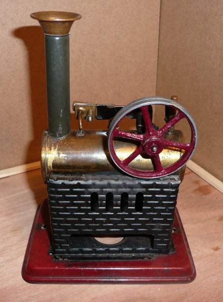 A small overtype engine with locomotive style chimney fired by a single wick spirit burner. The burner sits in a cut-out in the base, centrally under the boiler. This is the type of solid, compact unit that may have inspired the later Mamod MM series engines. Lovely pressed brick-effect firebox.