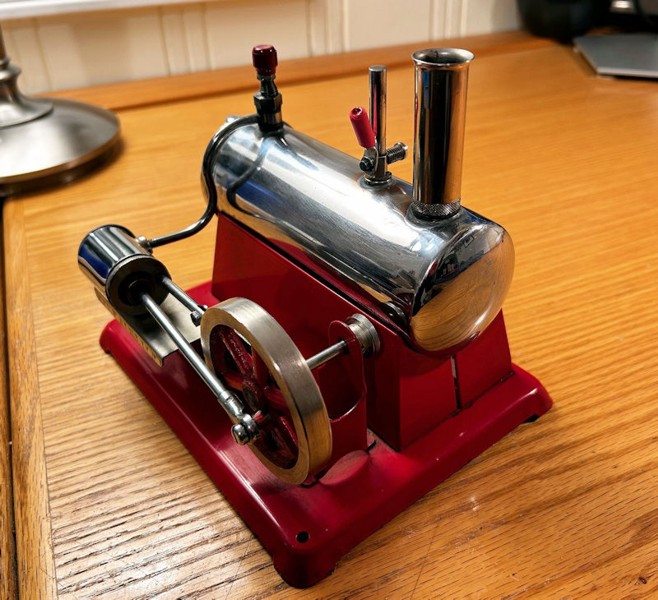 Engine was given to me in 1960 for my tenth birthday. The lever for the steam whistle was thin and broke at some point, which seems to be the case in all the pictures I've seen. I just made a new one from a type of screw I found with a flattened end. I drilled a hole in it and bent it, and I think it will work fine. The threaded part is covered with 4 layers of shrink wrap, with a dab or red paint on the end to make it all red. I lost the original cord and am waiting for the replacement to arrive so I can see how it runs, or if it will run, after sitting while waiting for me to get back to it (a few decades).