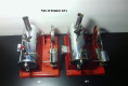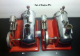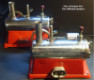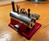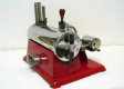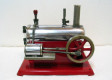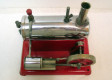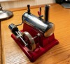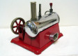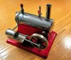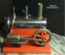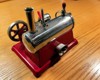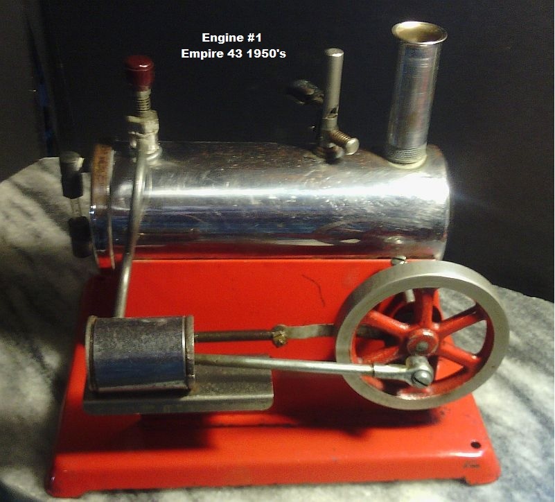 Manufacture date unknown. It only has "43" and 115 volts, 400 watts stamped on the bottom. The heating element does not work, but it runs well on air. The base plates measure 8 x 6 1/4 inches on both. #1 is a darker red then #2. Both boilers are approximately 6 3/4 inches long and 2 1/2 inches in diameter, though engine #1 has a thicker cap on the sight glass end. Both have a smooth finish on the back side of the boiler with no cap. Both measure 6 3/4 inches tall from the bottom of the base to the top of the stack. Both have the pressure relief valve located in the stack. Some of the major differences between the two are as follows: Whistle placement, on #1 is towards the back of the boiler just in front of the stack, where as on engine #2 it is centered between the flue and steam regulating valve. The whistles are just under 2 inches tall. #1 has a flat top where #2 is domed there are also other minor changes between the two. Throttle knobs on both engines are made of red "Bakelite" but each has a different design. #2 having more of a mushroom shape. Engine #1 has a round piston rod connected to the flywheel that pivots at the piston. #2 has a flat connecting rod from the flywheel that connects to the piston rod and there is a dome on the cylinder where the rod enters the piston. One piece cast cylinder and steam chest on both. If anyone has more information about these engines, please contact me David aka. "SteamN" at geosearchn@gmail .com