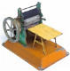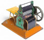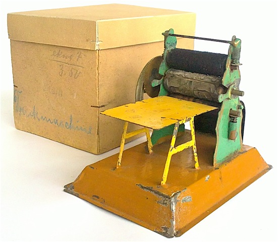The Falk press comes with 3 clich? rubber barrel-stamps, ink-tampered by the above-laying felt ink-tamper. The press-paper from a paper-roll behind the press (in the black holder) was led to the pressing-table. Now moved by a steam-engine via the spring on the wheel Birds, Transportmeans or Oriental Mammals were pressed. The press came in this original box (lid replacement), with Dr?chine, ekno 7, 3,50 and (modelnr.?) 242/3, written in pencil, black and blue. About Joseph Falk as the original mark of my press, I am not sure: contact with Lankes Auctions resulted in their mentioned origine, Falk. I have seen 3 more species on internet, no marks mentioned. I am open for suggestions about its origin and date.