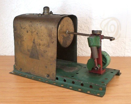 An engine by Gem Products of Wiltshire, U.K. Their logo was a red triangle, the ghost image of which is visible on each side of the brass boiler shroud.