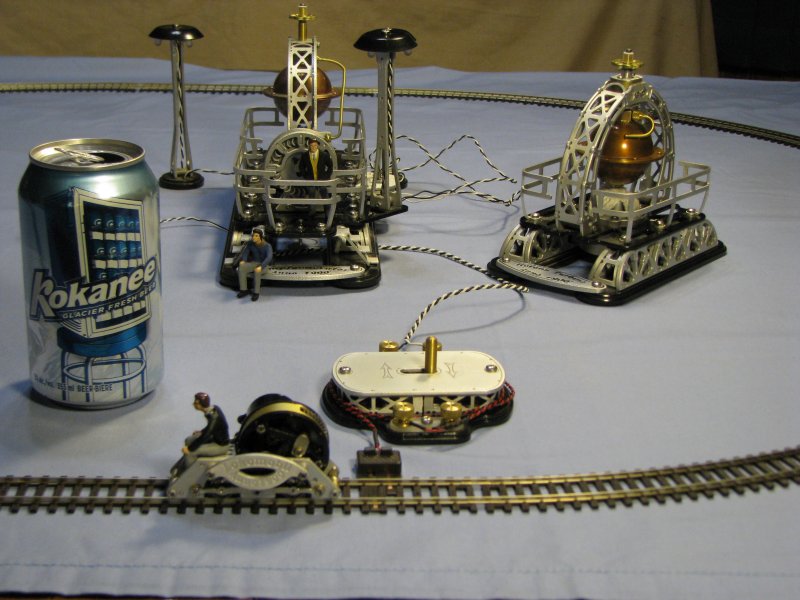 The Anno 1900 line from Karsten Gintschel features a matched Lok-O-Mobil on HO scale track, and a Herons Ball stationary steam machine. The turbine generator can power at least four lights as well as the Lok-O-Mobil. A forward-reverse switch is included.