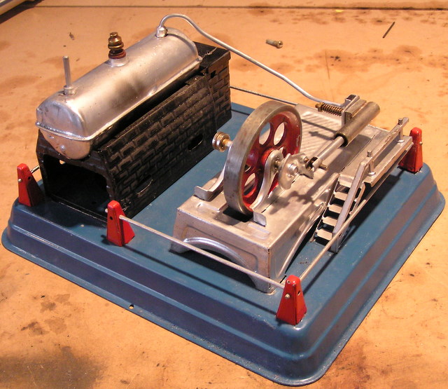 The boiler is made of two tin plate stampings, and it is fueled by a tiny can of sterno - later models are fueled with solid tablets - and the very last models have a brass boiler.