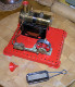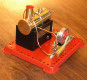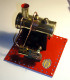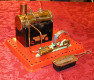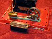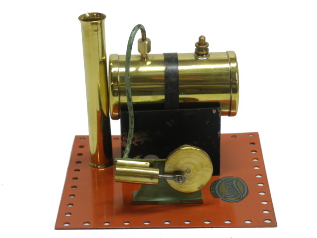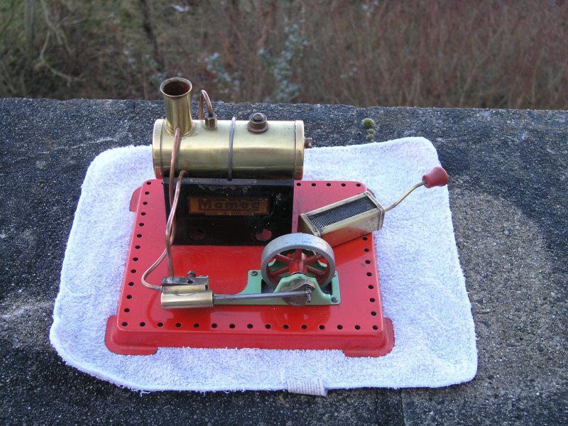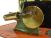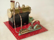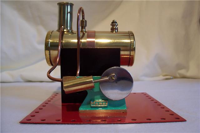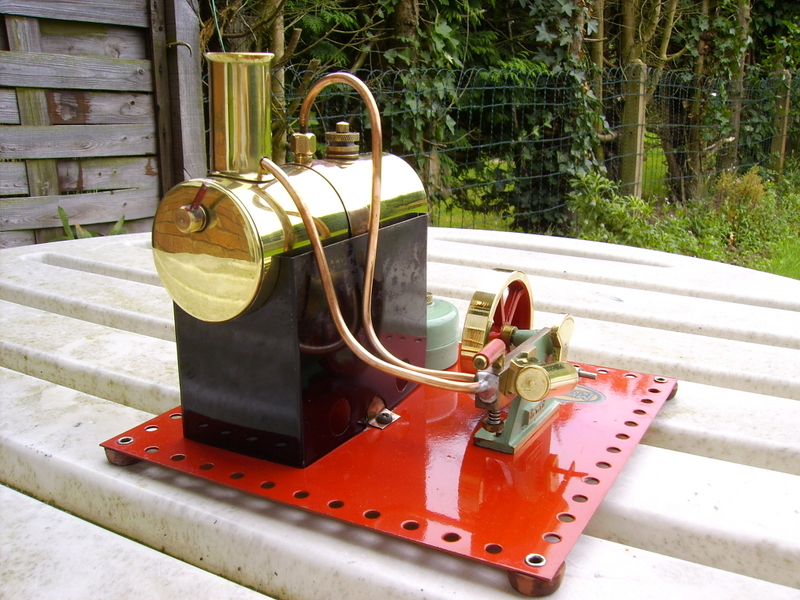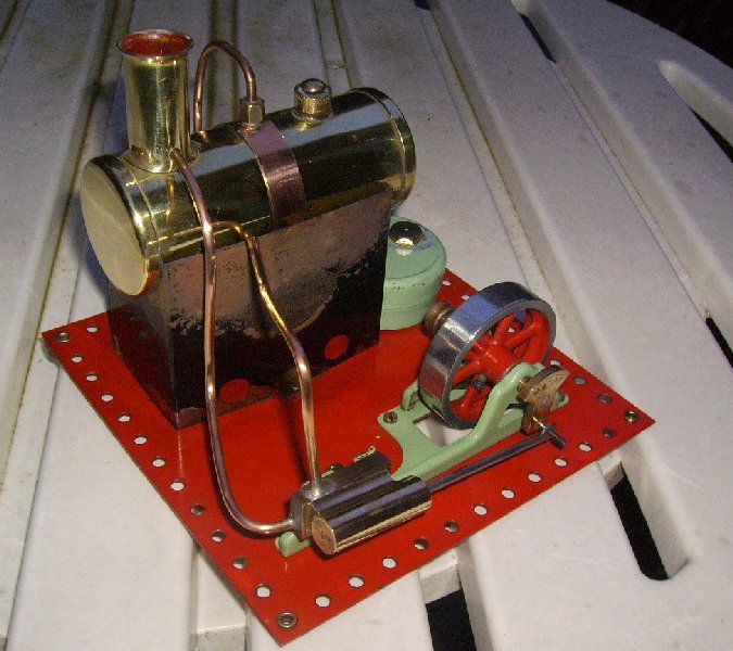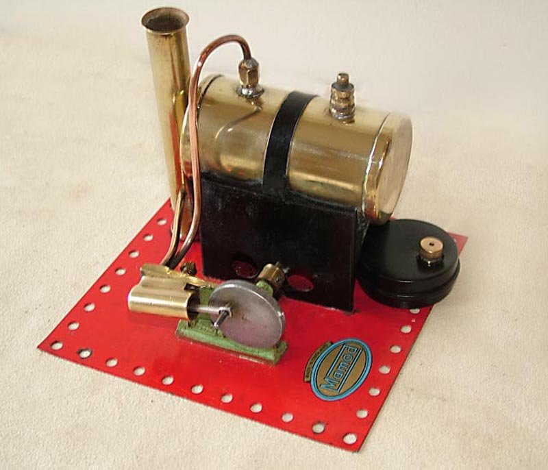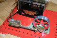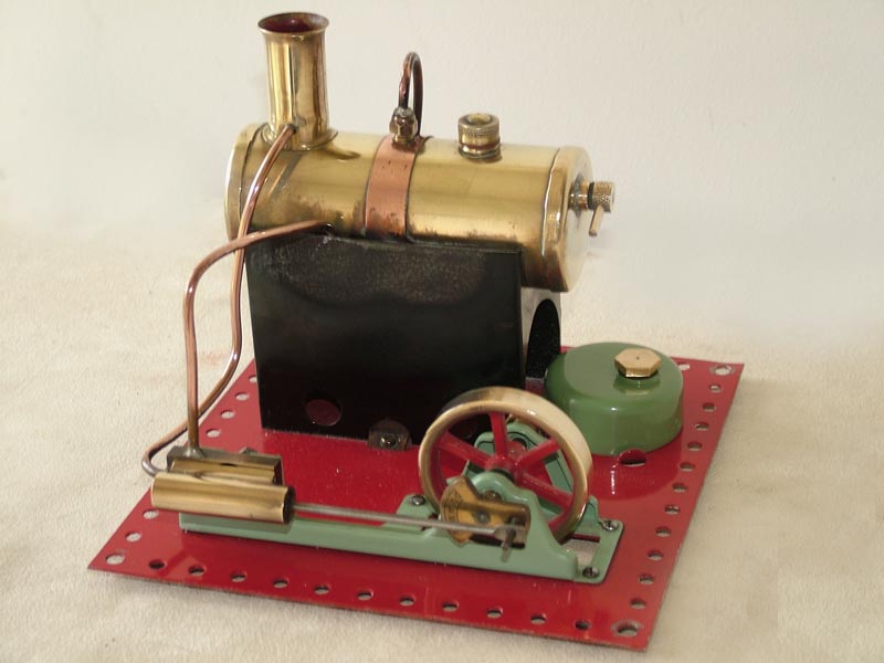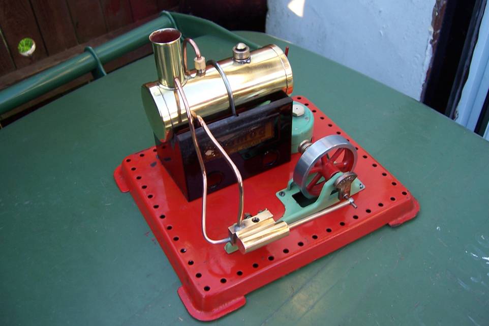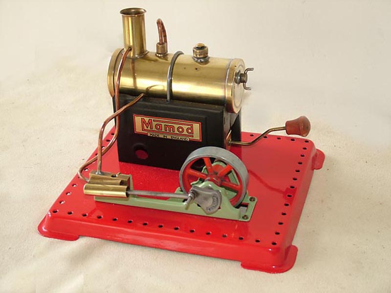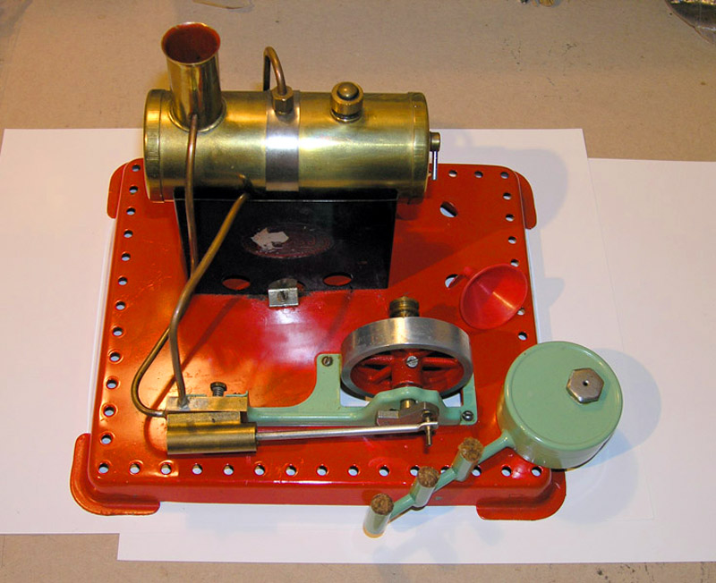 Early, pre-war Mamod SE1. Painted steam line (soldered to engine frame instead of union nut), brass disc crank, no exhaust to chimney, and dark Hobbies red paint on underside.