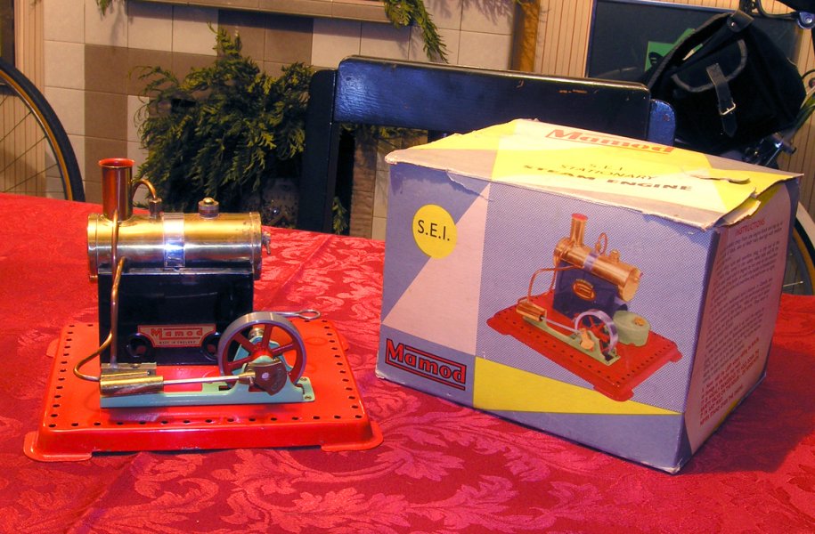 1967 Mamod SE1, probably one of the last to be made. Union bolt steam pipe fixing and superheated, driving a piston with oil felt pad lubricator engine block. Complete and boxed. Replaced by the SE1a in the same year.