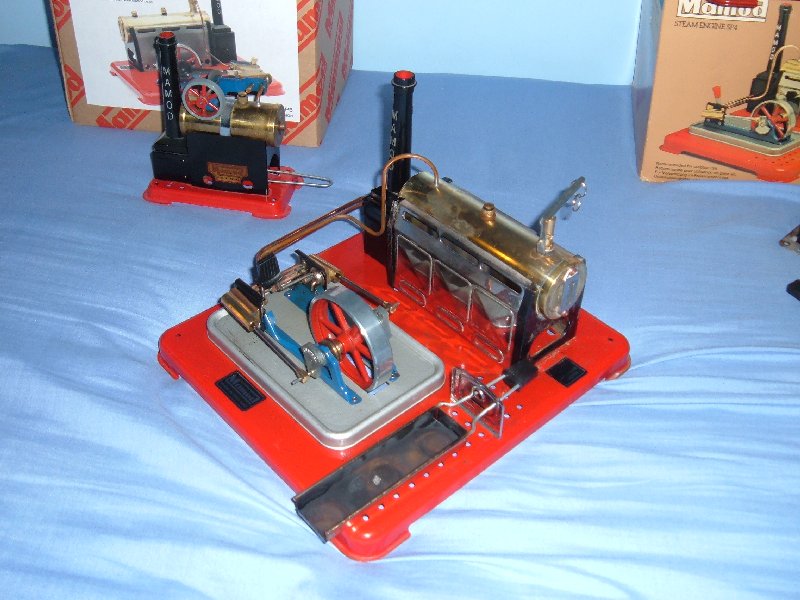This Mamod SP5 twin dates from 1983. It was introduced into the updated stationary range in 1979 and featured exhaust to chimney and twin reversible cylinders. Production of this fine engine ceased in 1985, along with the SP1 and SP3.
