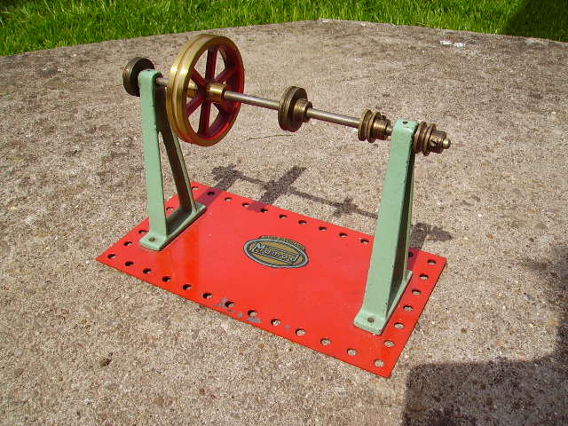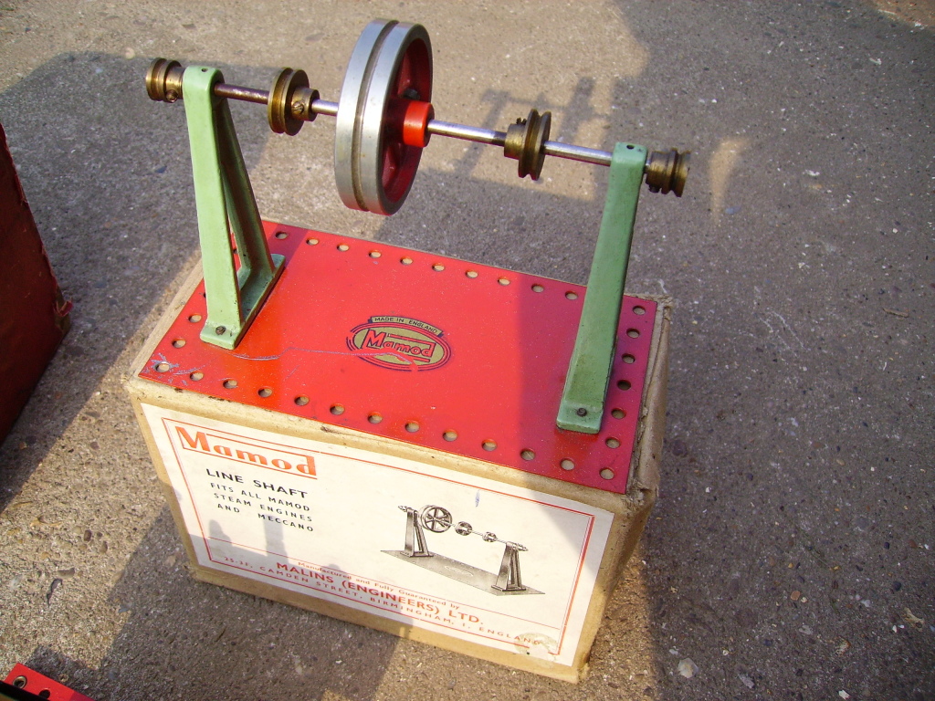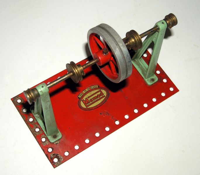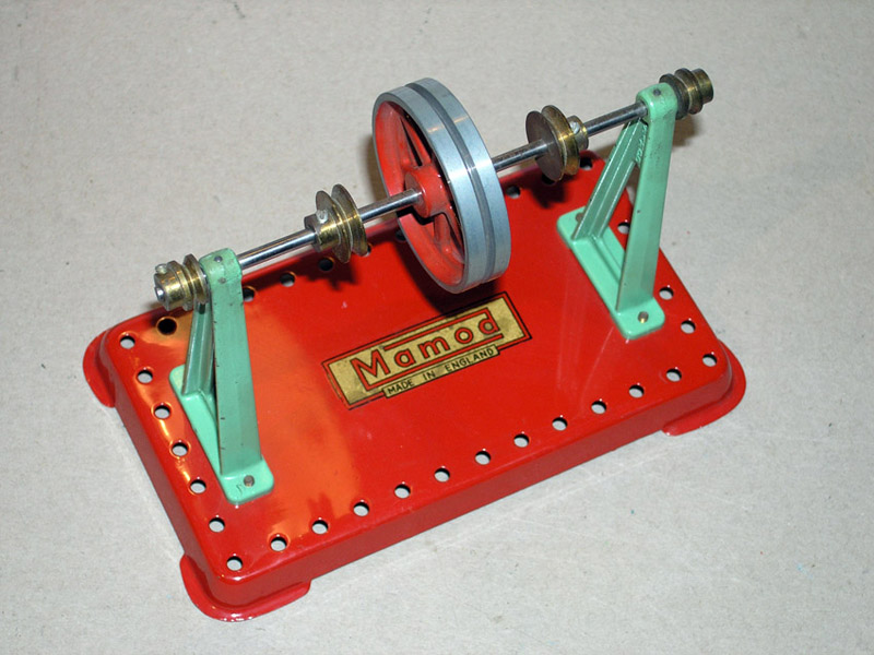 1953 Mamod flatbase lineshaft. This was the last of the line for the flat base lineshafts. It features the new mazak flywheel and pedestal supports along with the (then) new red oval decal. A rare combination which lasted for approximately one year.