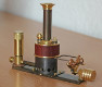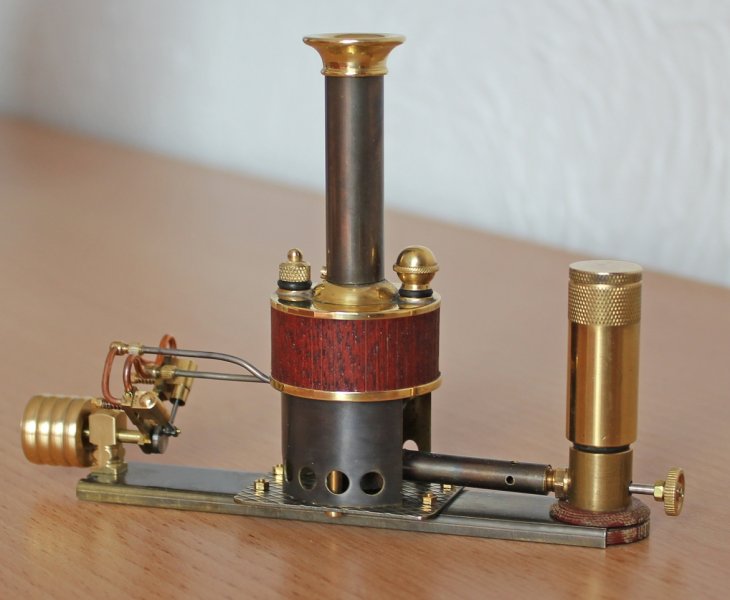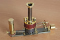 " To quote the maker (Phil Gravett) ""this engine unit was originally designed to go in a 15"" open launch designed by Richard White of ship and boat international, but be able to slip into any suitable hull instantly. ... it is just a v twin variation on the Jenny Wren but with a stainless superheater. It needs this as the ceramic burner glows red hot. the boiler is Simpson Strickland Kingdom type in look although no tubes."" "