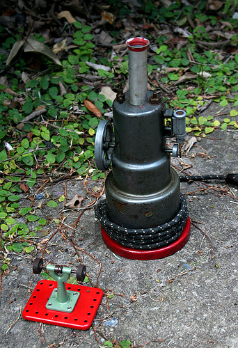 These came in many variations, including a sterno fired version, a slide valve version, and a variant with a water sight glass. The boiler is made of steel and is welded together instead of soldered, so even if run dry the boiler cannot be ruined (according to the instructions anyway). The flywheel and cylinder are pot metal, and the cylinder is double acting.