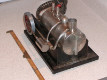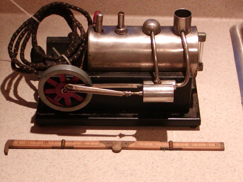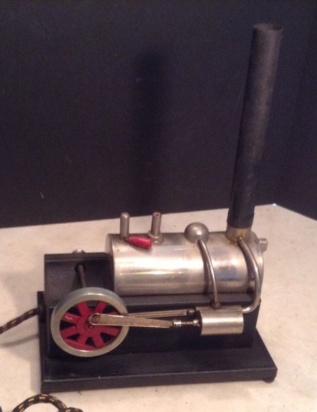 Unit is fully operational, includes original cloth cord and instruction sheet; all parts in place but has steam leak at cylinder valve and the boiler is dented at the whistle. Sightglass has minor leak at bottom fixture.