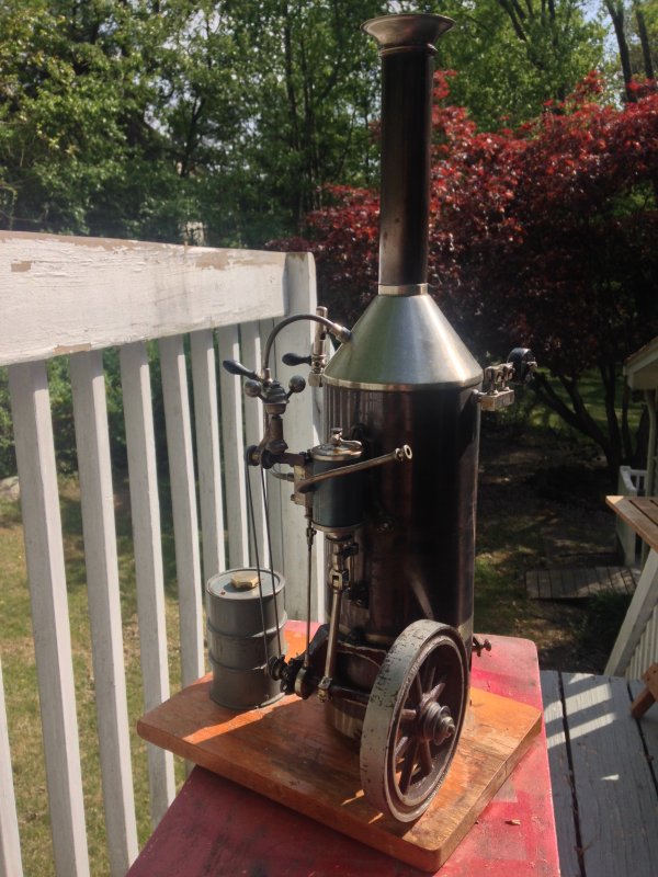 " This is an early Schoenner model 160/4. Probably made in the early 1920s. You will notice the original burner was replaced with a Faux model of a 55gal drum and piped into the firebox with four wick burner. It is quite realistic looking. I have the original base but kept this as I bought it. It stands at 17.25"" high, 4.5"" wide and has a 4.25"" flywheel. It is one of the largest vertical Schoenners made and runs perfectly. Model includes site glass with drain cocks, operational Flyball governor on pulley, whistle, adjustable weight pressure valve and steam throttle valve. A fine example of early Schoenner craftsmanship. "