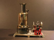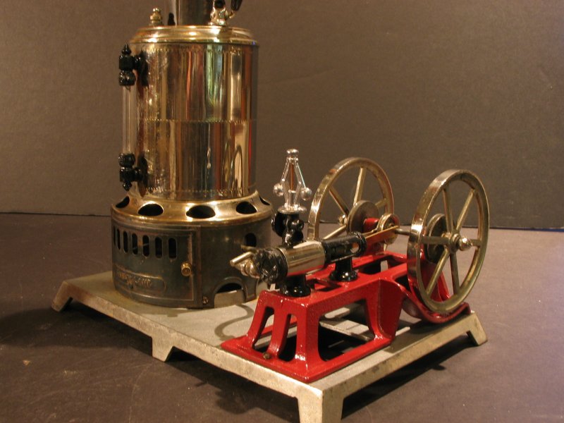 A large toy engine with a over sized brass boiler that is nickel plated. There were variations of the engine which included a nickel plated base but others had a painted base of various colors. The firebox and chimney are blued steel in which they made a two door model and a single door model which had the burner attached to the door. Earlier models had two doors on the firebox and a lead whistle and safety valve. This engine is considered scarce in any condition. The 49 was made from 1898 at a cost of $5.00 until 1926 costing $7.00.