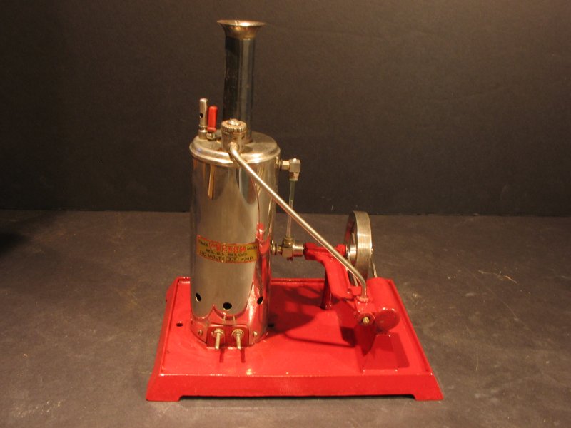 Made from 1930 to 1940. A cast iron base engine with cast lead parts makes this a heavy engine. Fired by electricity, its a fast and strong runner. The boiler and firebox are nickel plated brass which has a filler/relief valve, whistle and water sight glass. It has a reversible engine and was fitted with a throttle in 1935. The engine cost $7.75 in 1930.