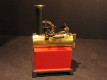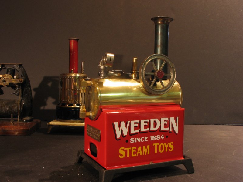 This is a Weeden No. 702. Production was from 1935 to into the 1940s. It has a cast iron base with a tin plate fire box and brass boiler. A electrical fired boiler produces too much heat and regularily pops the relief valve. Very fast engine and the side looks like a billboard so I utilized it. This engine is the sibling to the 802 which was the same engine but alcohol fired.