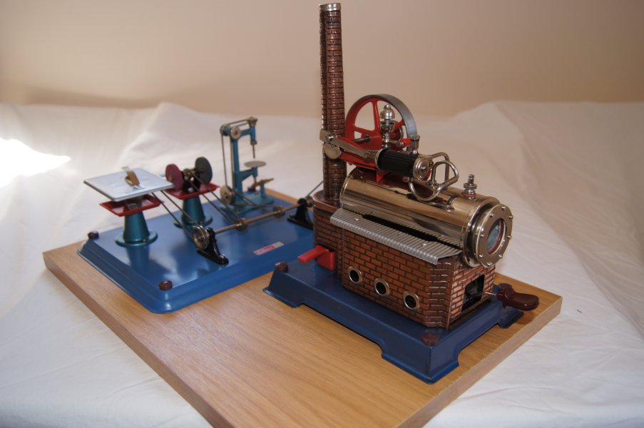 This Wilesco engine is a fully working model, with an end water sight glass, pressure relief valve, whistle, piston speed valve, tablet burner, and steam drip tray. It has one output steam pipe to the overhead piston head, and one relief pipe to the detachable chimney. It is displayed on a board together with a Wilesco modern tool station comprising of a table bench saw, twin wheel grinders, and a vertical pillar drill. These tools are all working tools. The 4 way line shaft being pre fitted on this set. Note that this is an early type D14. The way to find out is by measuring the diameter of the thread to the pressure relief valve. I puchased a modern compessed air adaptor only to find out it was too small, and that was because Wilesco made the older version D14 with bigger drilled and tapped hole into the boiler.