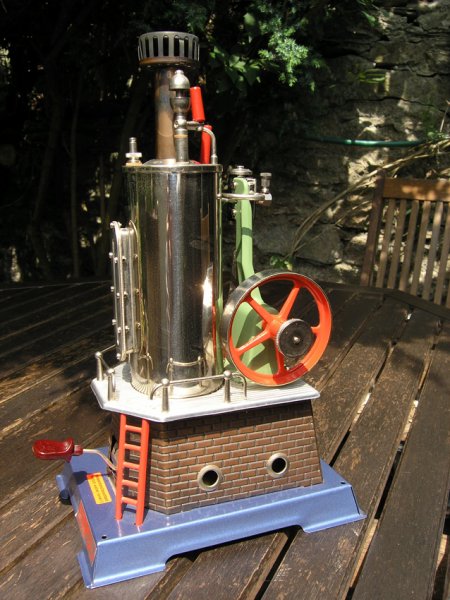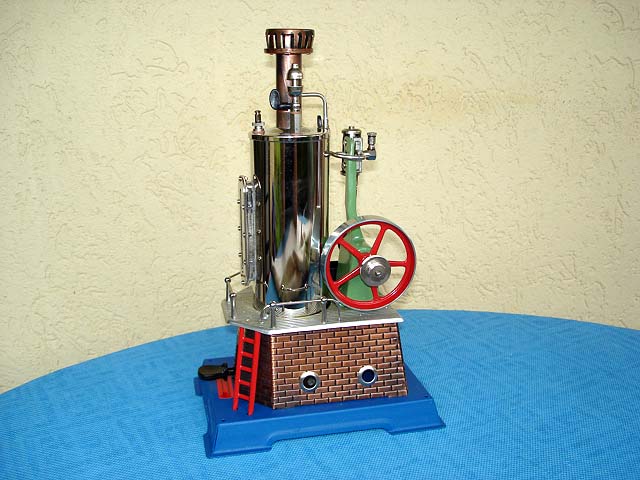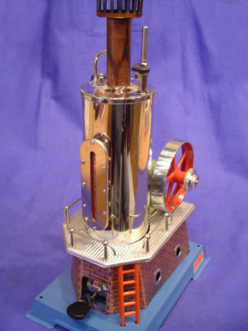 | Notes: | Model D455, Vertical Steam Engine. Built approx. 2005. Like the Old Smokey Roller...this is another engaging engine made by Wilesco. Formally sold as the D45, it got the extra digit when another version came out in brass trim. It generates high RPMs and being a vertical design is a bit different when most of my collection as horizontal boilers. Like the Old Smokey, this Wilesco is fired with Esbit fuel tablets OR for a bit more umph, a denatured alcohol (meths) burner will make it really fly. |