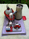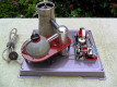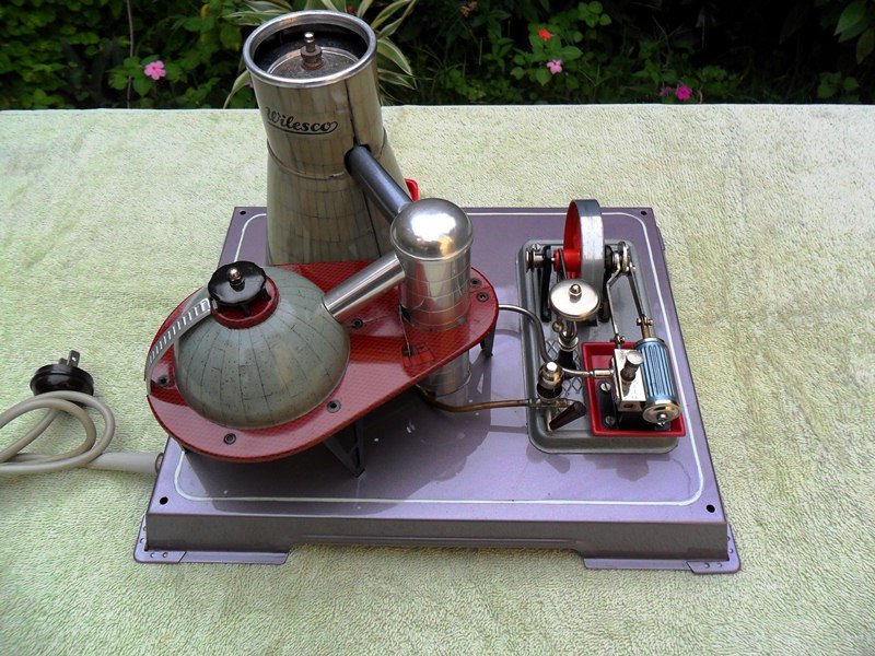 Wilesco ran production of these steam engines for a few years. These were available in stores in the period between 1958 and 1968 with very low sales, due to the fact that people was scared of anything with the word 'Atomic' on it, as it was associated with the Atomic Bomb. The Cold War was raging on during those days, the 'Missile Crisis', the Berlin Wall and the arms race between the East and West was the note of the day. Shelters, to survive atomic attacks, were being built in the USA and Europe in preparation for war, in fact, we were this close to have one! There was nothing wrong, in terms of functionality, safety or quality with this steam engine. It just came out, to the market, on the wrong period in history, so Wilesco quit producing them in short time. Atomic Energy proved to be unpopular at the time. As of today, they are very scarce and difficult to find in good condition. Usually these are very expensive. Electrically heated by coil system: 220 VAC for Europe. 115 VAC export versions, like the one shown here, were also manufactured. Power consumption: 250 Watts. Steam Engine is based on the Wilesco D10 platform - Stroke 16 mm - Diameter 9 mm - Flywheel 70 mm.