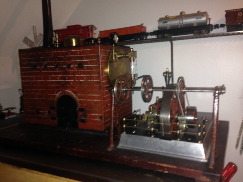 This is a #204 engine, (22mm Bore x 25 stroke with 160mm flywheel), it is fitted with a 300mm x 150mm Boiler) with whistle, manometer, pressure gauge and single arm blow out control site glass. All brick Stenciling is original. Note also, three Pully line shaft in same color pattern and design. Entire piece is 27 3/8" x 17 3/4" or (648mm x 444mm) long by wide and weighs 14.5kgs. It was made between 1908 and 1924. It was one of Wilhelm Bischoff's more Aesthetically pleasing plants. And very powerful. One drawback is I do not have original boiler and use a Josef Falk Triple burner which works well but takes the massive boiler 25 minutes to heat to steam at half capacity. This is a large And robust plant made by one of the early German masters who was once Dr. Oskar Schneiders Predecessor. In the mid thirties, Heinrich Rehse took over Wilhelm Bischoff's company and continued to use much of his castings to build very similar. If not the same engines.