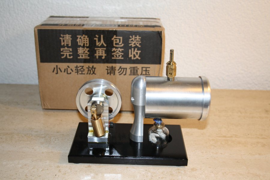 A simple oscillating steam engine with a different design though. I bought it last year and received it just now. It was manufactures in Guangdong, China by the Zongshan Factory. It is described as Hot Live Steam engine Cylinder Unibody Design. It is made of aluminium and brass for the cylinder.
